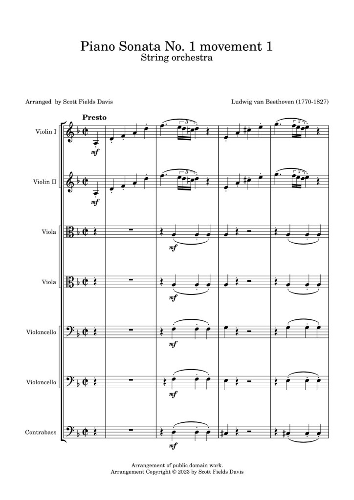 Ludwig van Beethoven (1770-1827) was a German pianist and composer. He is one of the world’s most admired and celebrated composers. Beethoven composed 32 piano sonatas. This is an arrangement for string orchestra of the first movement of the first piano sonata by Scott Fields Davis.