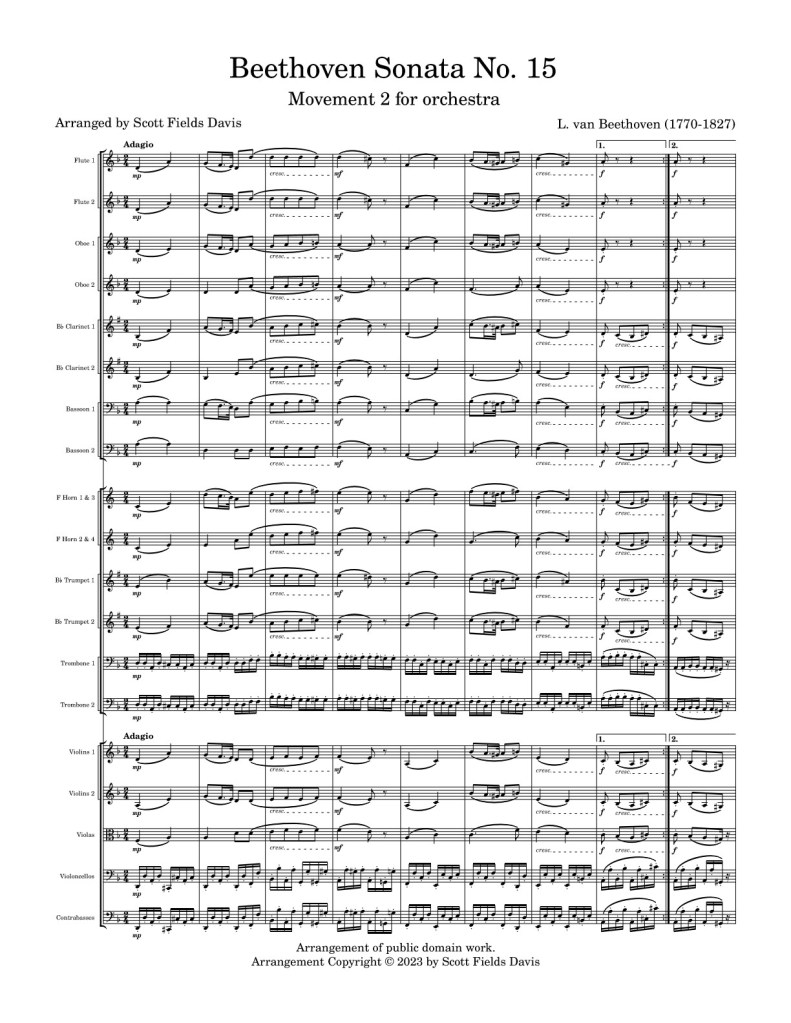 In this arrangement of Beethoven’s Piano Sonata No. 15, Movement 2—a calm, lyrical Adagio reimagined for orchestra with warm woodwind colors and rich string textures. The gentle melodic lines—originally written for piano—are shared among the woodwinds and strings, while subtle brass and low-string support enrich the texture without disturbing the movement’s calm, flowing character. This arrangement preserves Beethoven’s poetic Adagio while giving it the breadth, color, and expressive depth of the symphony orchestra.