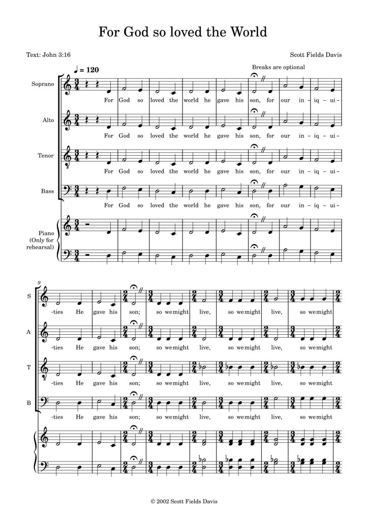 This accessible SATB anthem sets the beloved text of John 3:16 in a clear, heartfelt, and expressive musical style. The piece opens with steady, homophonic declamation of the words “For God so loved the world” (page 1), allowing the meaning of the Scripture to speak directly through the choir.