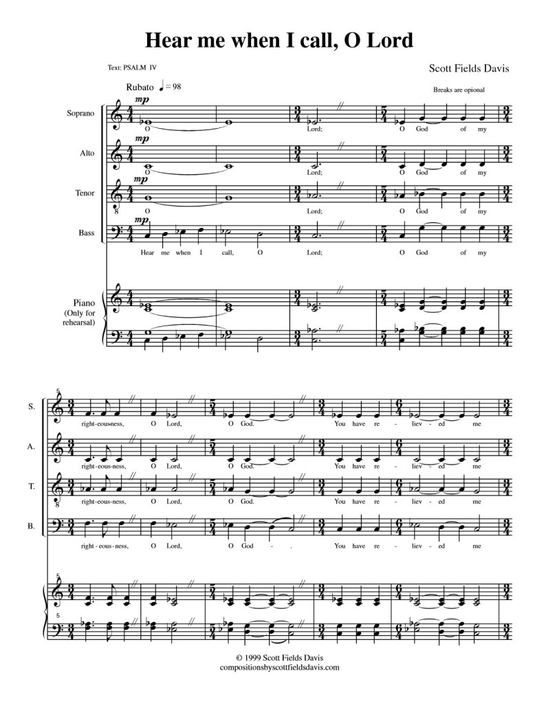 This expressive SATB setting of Psalm 4 opens with a quiet, pleading tone, “Hear me when I call, O Lord” (page 1). The voices move together in a clear, homophonic texture, allowing the sincerity of the text to come through with warmth and clarity.