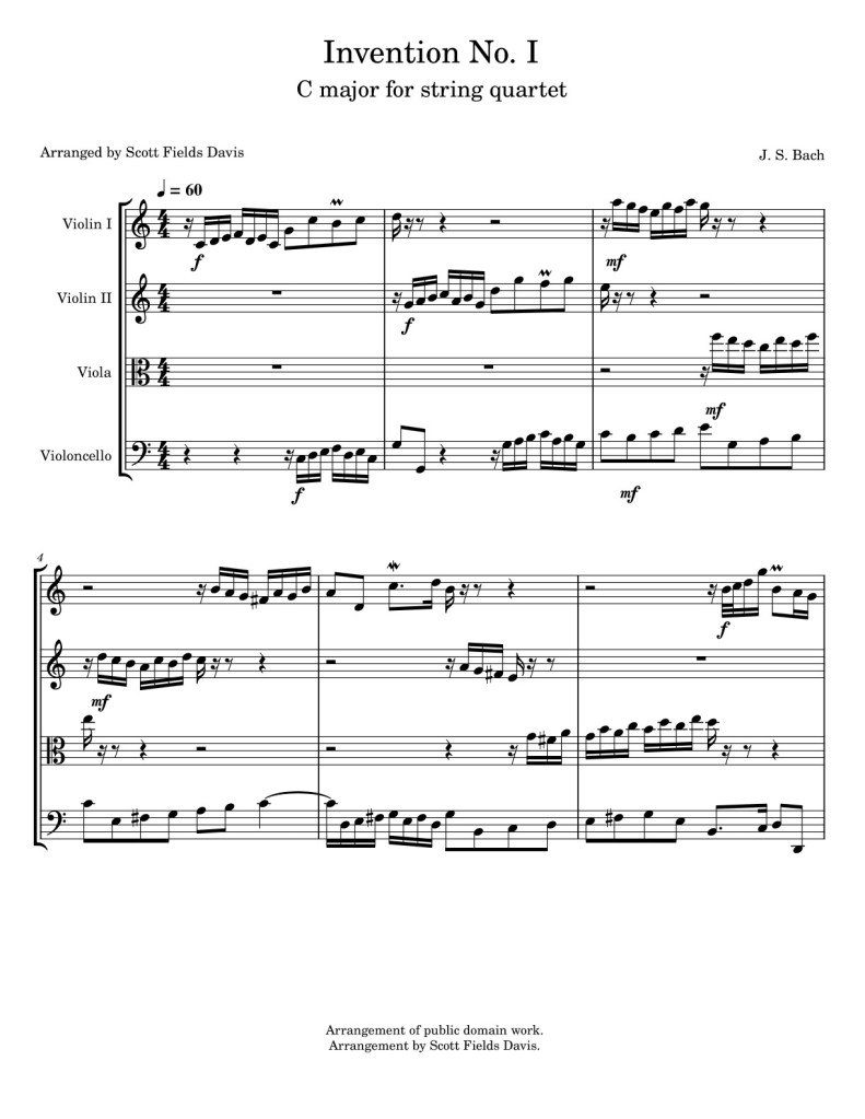 The Inventions might just be J.S. Bach’s most well-known piano compositions. Whether you are a student or a professional, if you are a pianist, you have played a few of them. Composed by Johann Sebastian Bach (1685-1750) and arranged for String quartet by Scott Fields Davis.