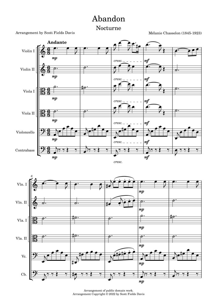 This lyrical nocturne by 19th-century composer Mélanie Chasselon is transformed into a warm, expressive setting for string orchestra. This arrangement preserves the gentle, leaning phrases and flowing melodic lines, giving each section moments of expressive dialogue. Rich inner-string writing supports the singing violins, while cellos and basses provide a steady, velvety foundation. The result is a tender, atmospheric piece that brings a lesser-known Romantic voice beautifully to life for modern ensembles.
